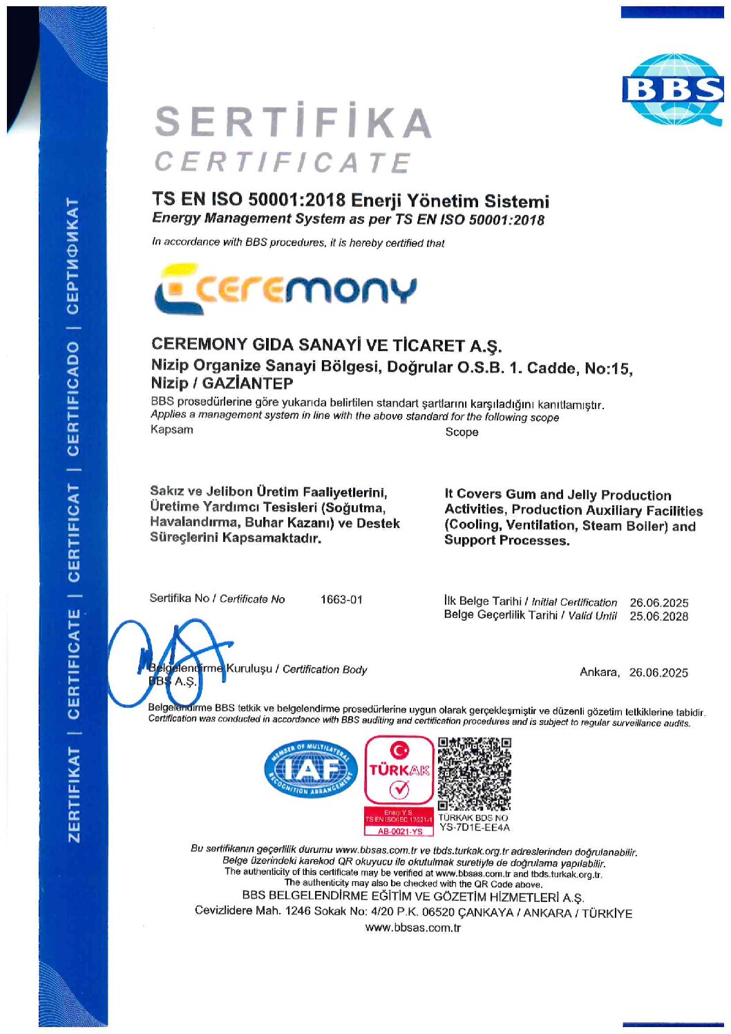 Ceremony Gıda A.Ş. olarak enerji kaynaklarımızı sadece üretmek için değil, gelecek nesillere yaşanabilir bir dünya bırakmak için kullanıyoruz. Sakız ve Yumuşak Şeker üretim hatlarımızda kullanılan enerji bizim için sadece bir maliyet değil; aynı zamanda verimlilik, kalite ve sürdürülebilirliğin de bir göstergesidir.